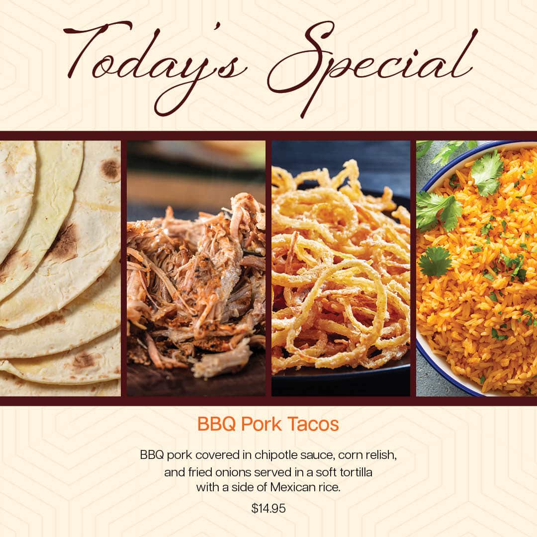 It’s Taco Night! Come try our BBQ pork tacos smothered in chipotle sauce, corn relish, and fried onions, and served with a side of Mexican rice for only $14.95.